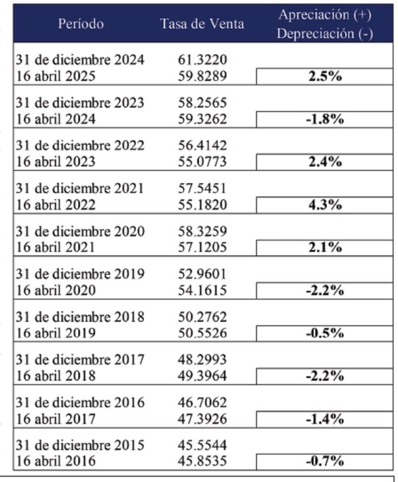 El 16 de abril de 2025, el peso dominicano se apreció un 2.5% frente al dólar estadounidense, ubicándose en el quinto lugar entre las monedas más fortalecidas de América Latina. Según el Banco Central, las tasas de cambio promedio ponderado para la compra y venta del dólar se ubicaron en RD$59.55/US$ y RD$59.83/US$, respectivamente.
