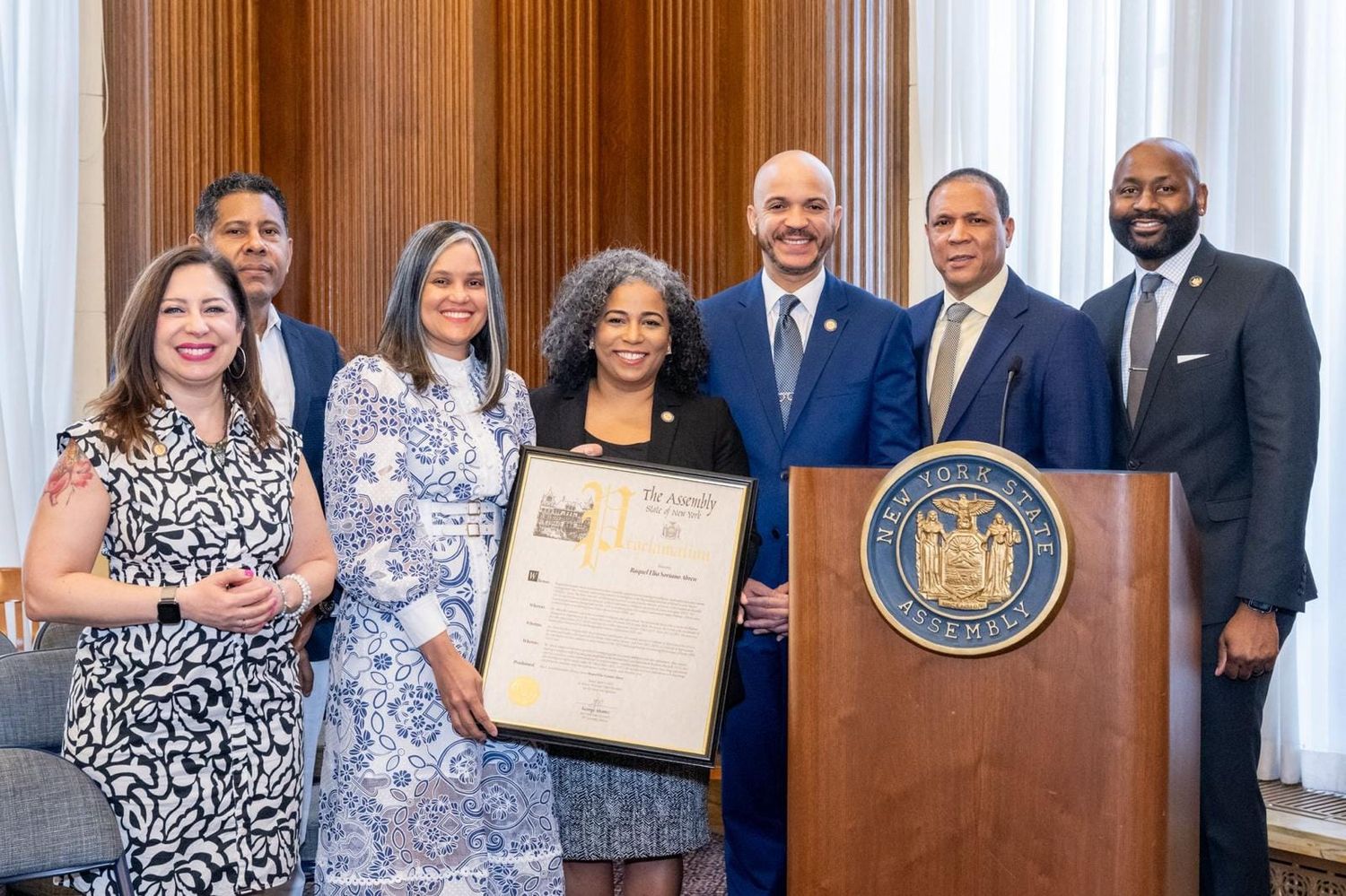 La ceremonia fue encabezada por los asambleístas de origen dominicano George Álvarez, Karines Reyes y Manny De los Santos, quienes entregaron las proclamas y ofrecieron palabras de elogio. “Raquel y Ángel representan lo mejor del servicio público dominicano. Su compromiso con la excelencia, la transparencia y la cooperación internacional es un ejemplo a seguir”, expresó Álvarez.