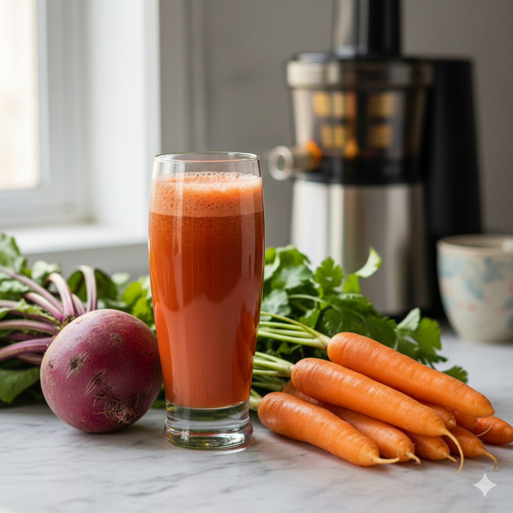 ¿Buscas una bebida nutritiva, deliciosa y fácil de preparar? Este jugo de remolacha y zanahoria es tu mejor aliado. Combina el dulzor terroso de la remolacha con la frescura de la zanahoria, potenciado por un toque cítrico y picante. Rico en vitaminas, antioxidantes y minerales, es ideal para empezar el día con energía o recuperarte después del ejercicio.