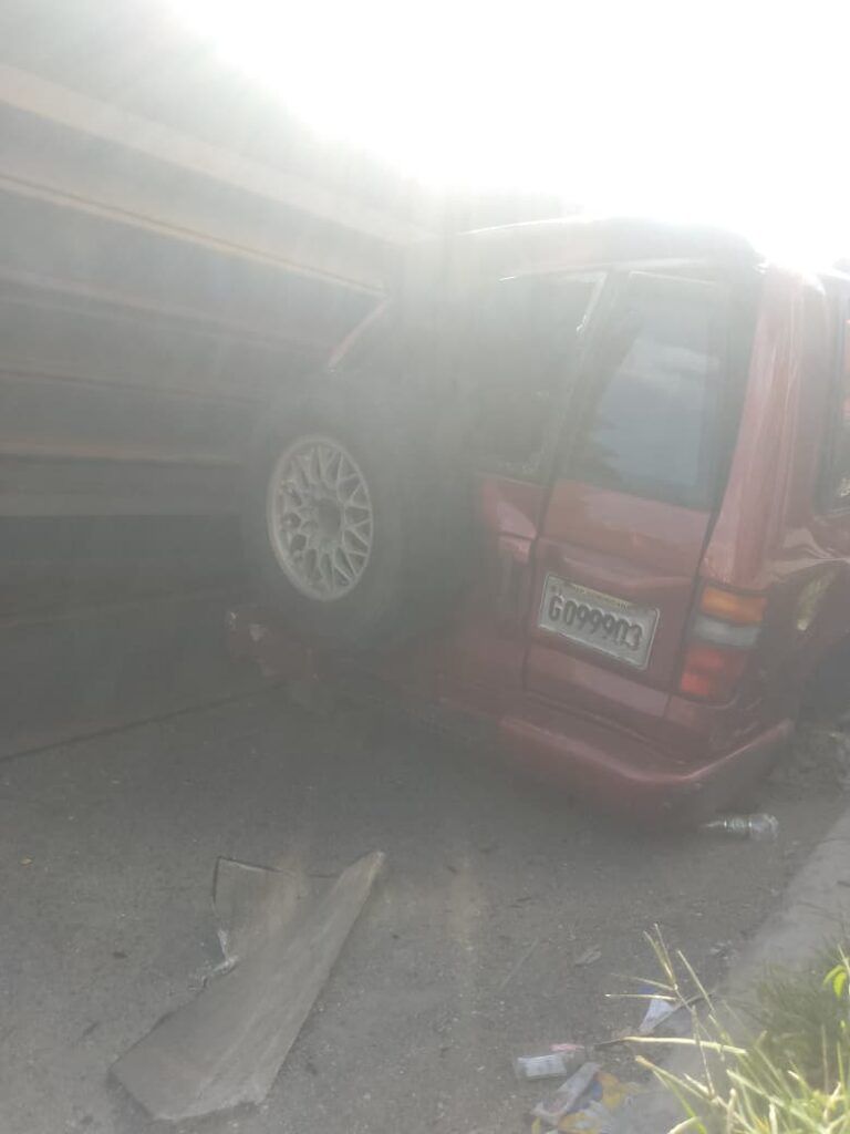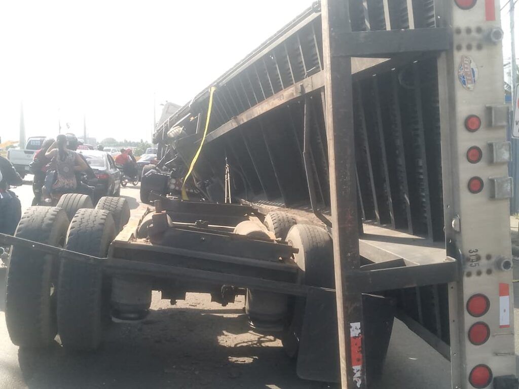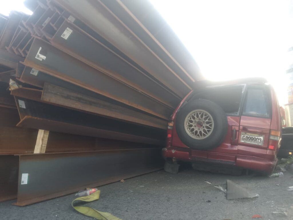 El incidente ocurrió aproximadamente a las 3:14 p.m., cuando un vehículo de carga pesada (patana) que transportaba barras de hierro perdió el control y se volcó sobre una yipeta marca Isuzu, color rojo, placa G099903.