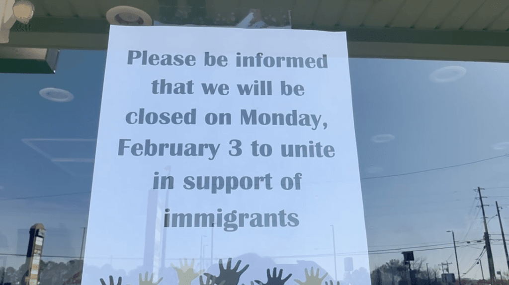 En Atlanta, muchos negocios hispanos permanecieron cerrados. Un cartel en una tienda decía: «Les informamos que estaremos cerrados el lunes 3 de febrero para unirnos en apoyo a los migrantes».